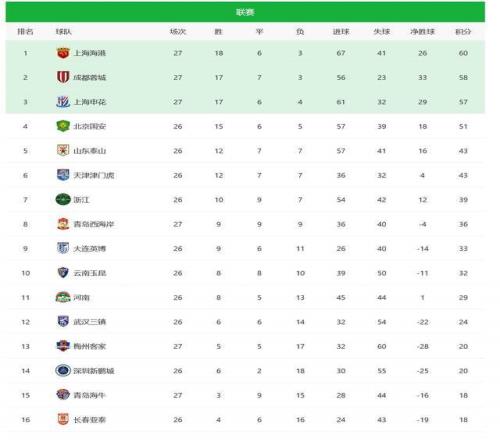 争冠三强先后全取3分,使得这一轮的争冠形势没有变化,海港率先撞线60分,蓉城2分屈居第二,申花57分位列第三,三队依旧只有最多3分的差距。